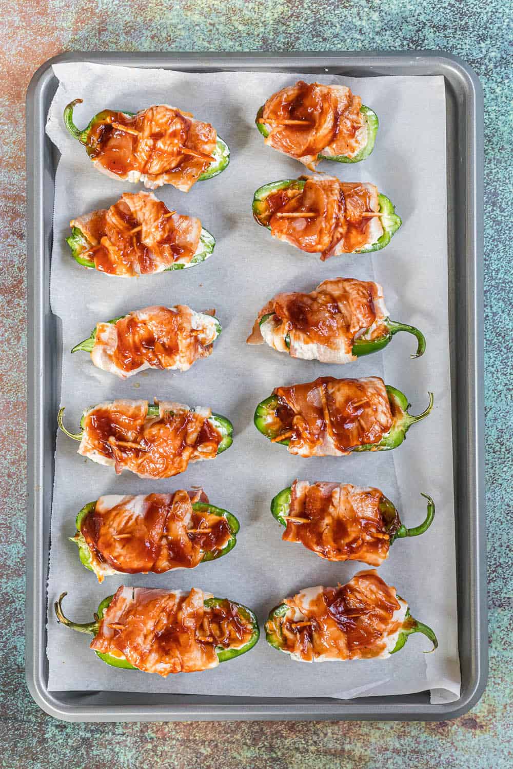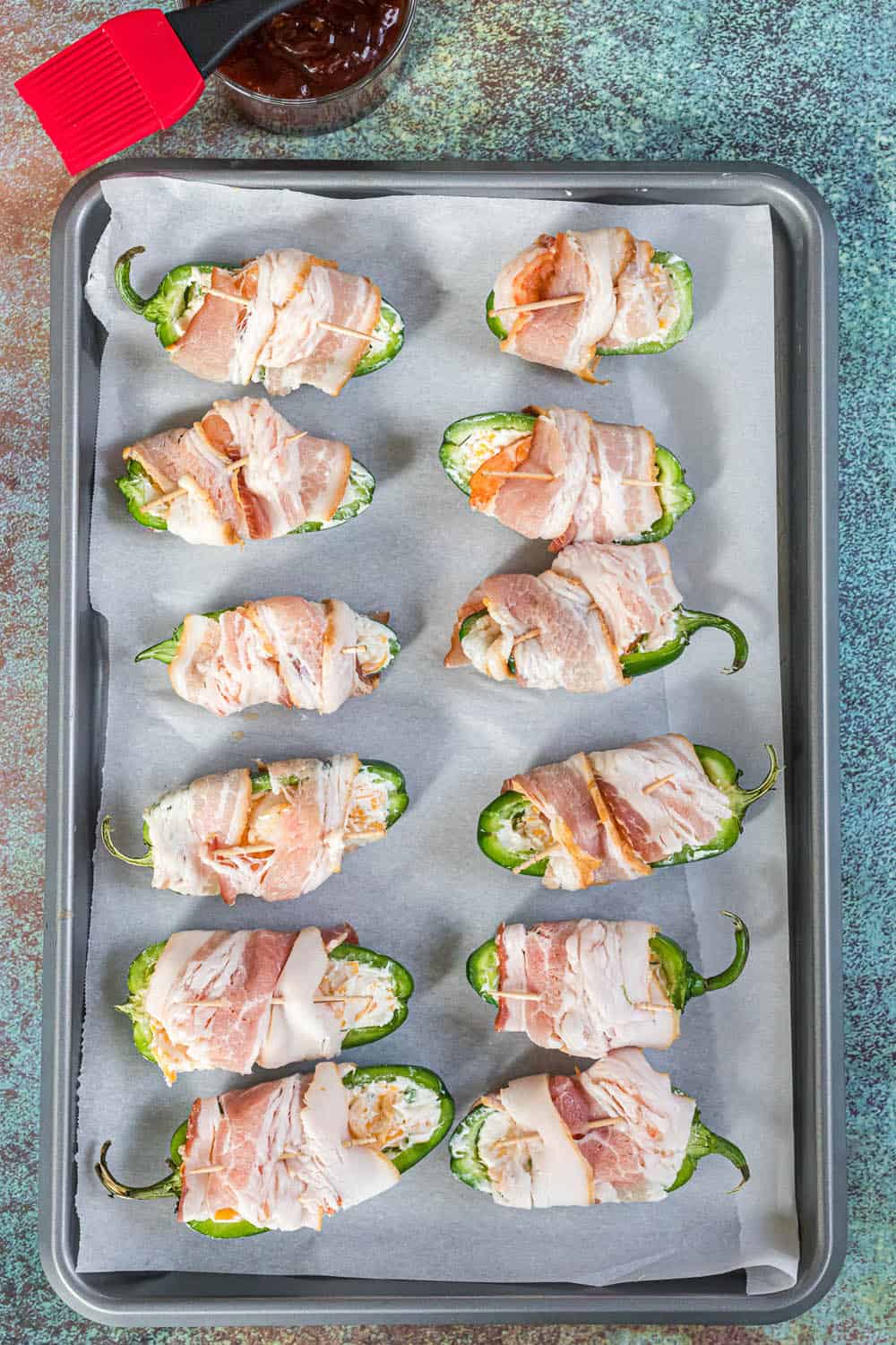 Place the bacon-wrapped jalapenos on the baking sheet as you work.
