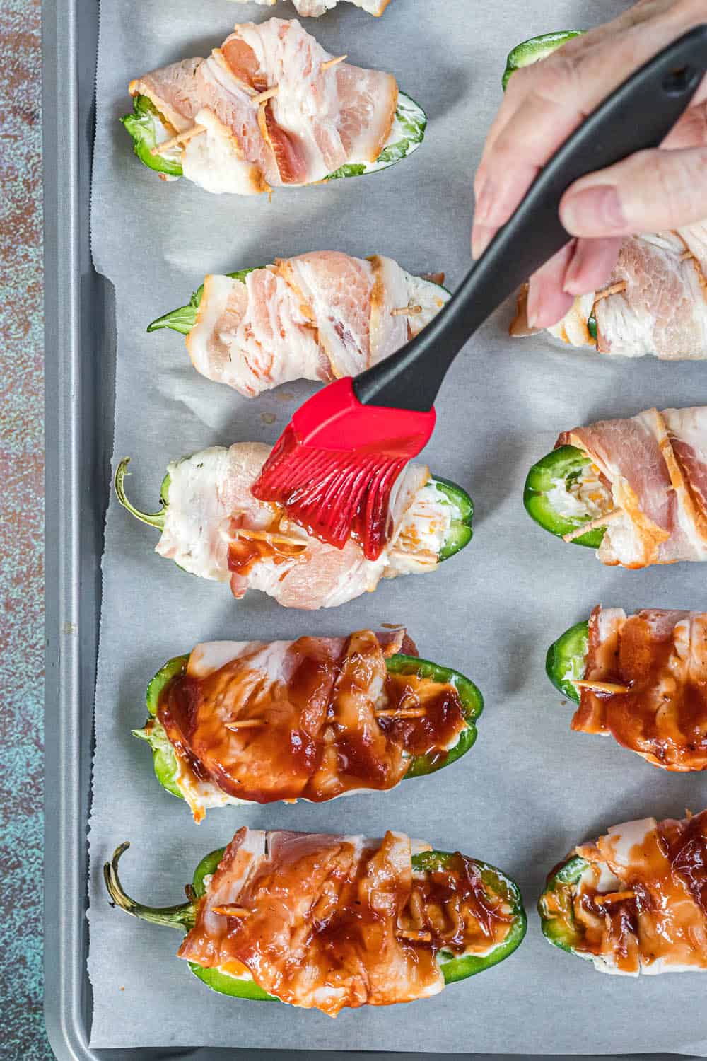 Use a pastry brush and brush each shrimp stuffed jalapeno with barbecue sauce. The poppers are now ready to cook.