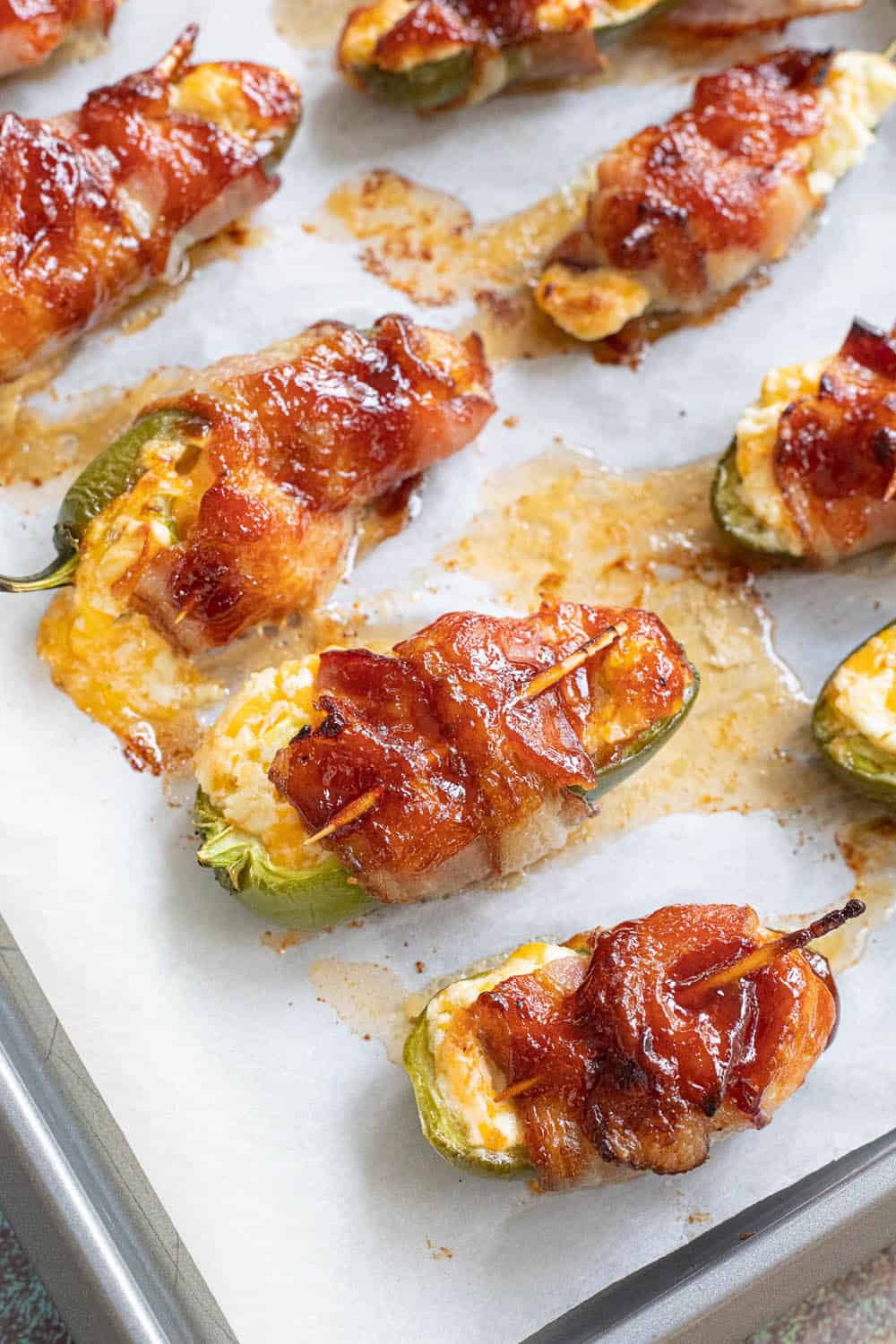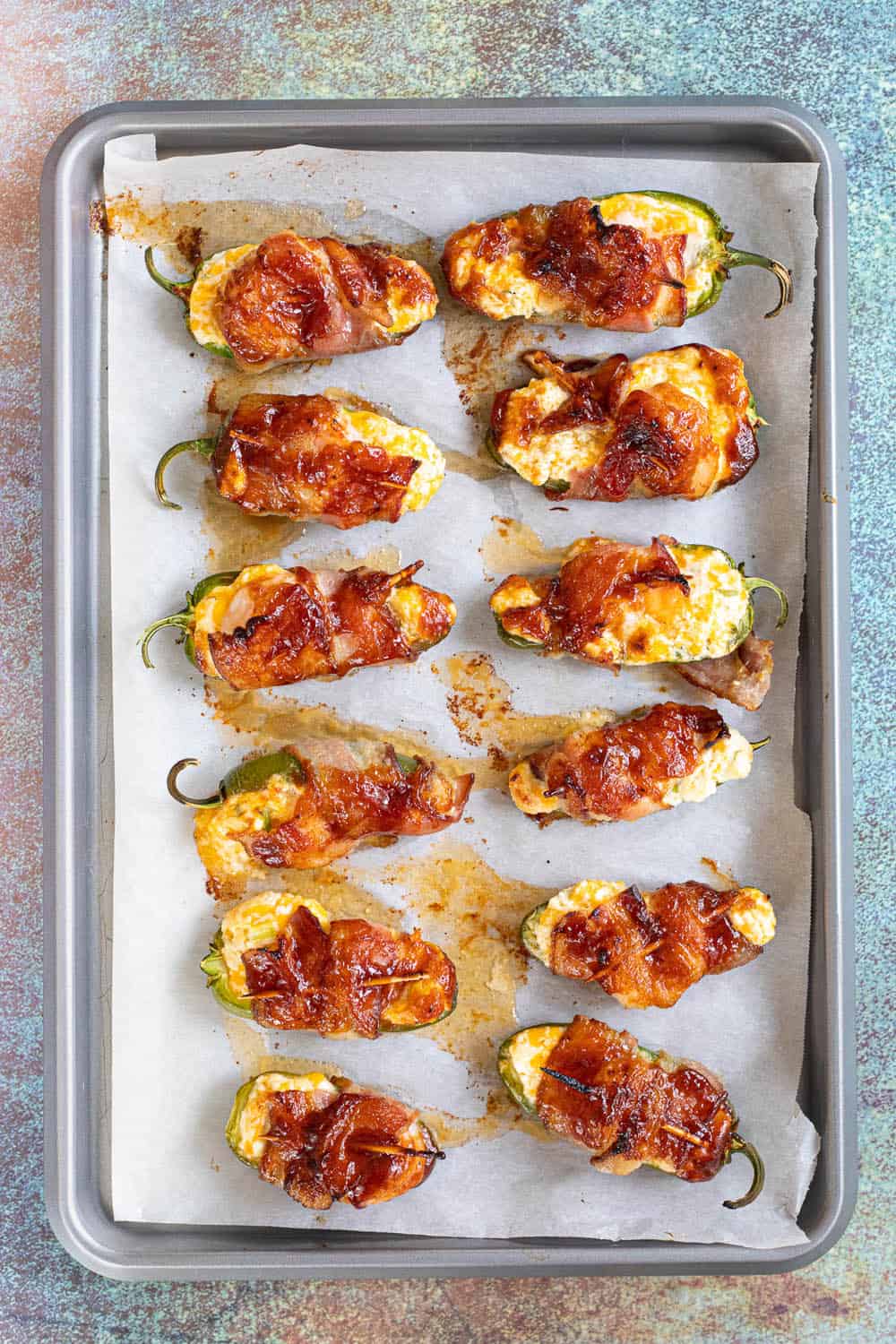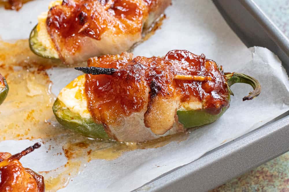 To cook in the oven, pre-heat the oven to 400 degrees. Move the poppers to a parchment-lined baking sheet.