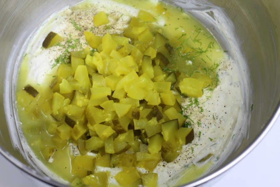 Add fresh dill, garlic powder, onion powder, salt, pepper and dill pickles. Use a wooden spoon and mix together.