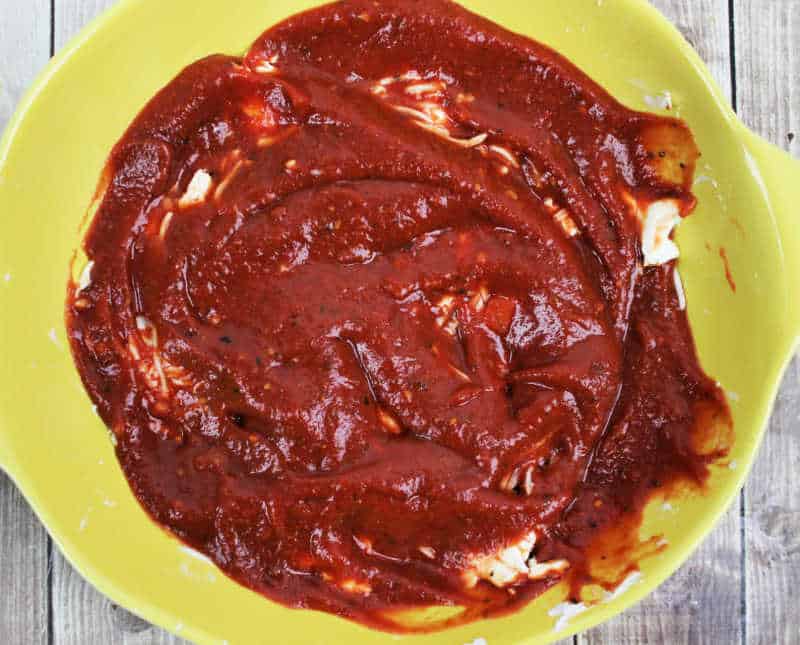 Carefully spread the pizza sauce or marinara sauce to evenly cover the mozzarella cheese. If you don’t keep pizza sauce around can use a can of tomato sauce. Just add some oregano, basil and garlic to it. Or use some marinara sauce for spaghetti. They all work great.