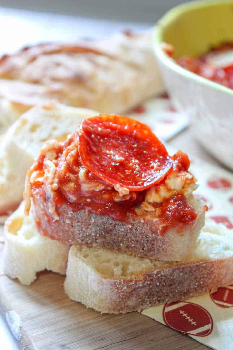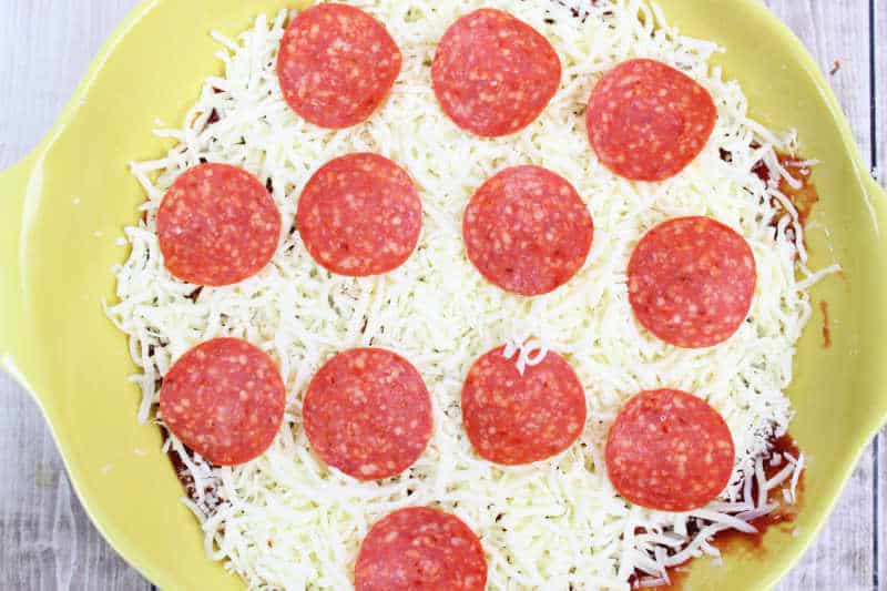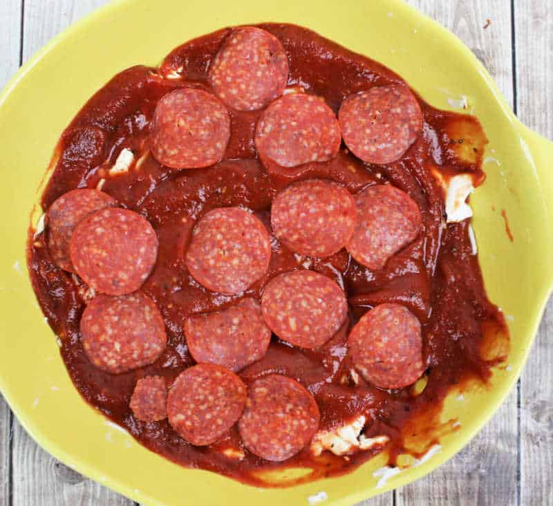 - Layer the pepperoni slices on top of the pizza sauce. You can use regular pepperoni slices but the little mini ones are really fun in this dip.