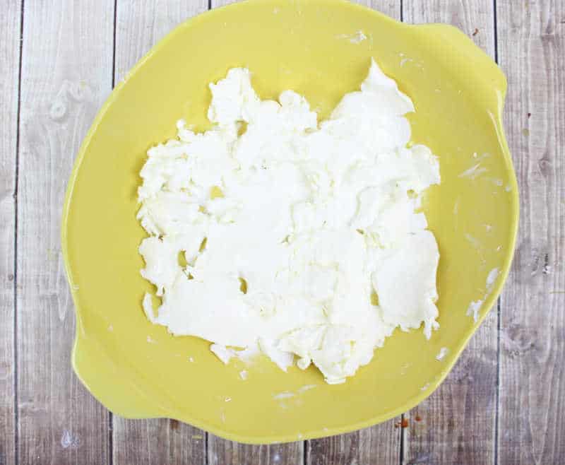 Preheat your oven to 375 degrees. Spread the cream cheese on the bottom of a shallow baking pan. You can use a cake pan or casserole dish. Whatever you have on hand. It doesn’t have to be spread perfectly. It’ll melt as it heats up.