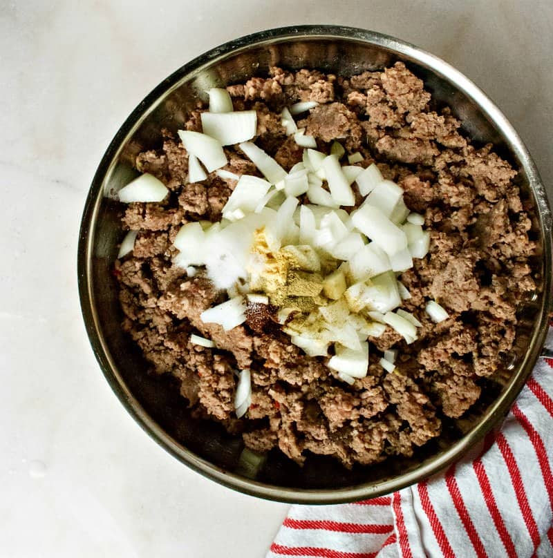 - Meanwhile, crumble the ground beef and pork into a large saucepan, and add the garlic, onion and water. Season with mustard powder, thyme, cloves and salt.
