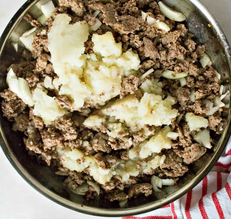 - Cook over medium heat, stirring to crumble the meat and mix in the spices, until the meat is evenly browned. Remove from the heat, and mix in the mashed potato.