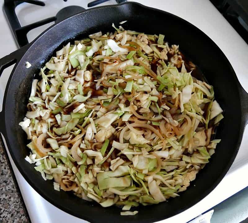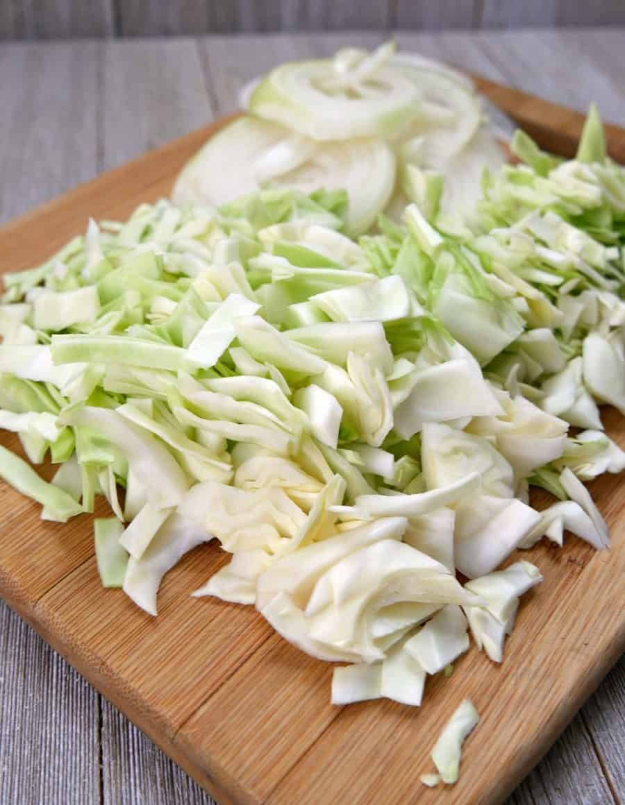 Start by chopping up a half a head of cabbage and some onions. Make sure to core the cabbage, too. If you want to make this even quicker, try a bag of cole slaw.