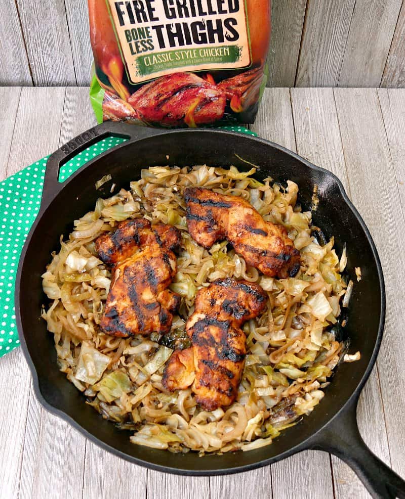 Add cooked Cooked Perfect Fire Grilled Chicken boneless thighs in Classic Style to the pan and nestle in the braised cabbage. Serve while still warm.