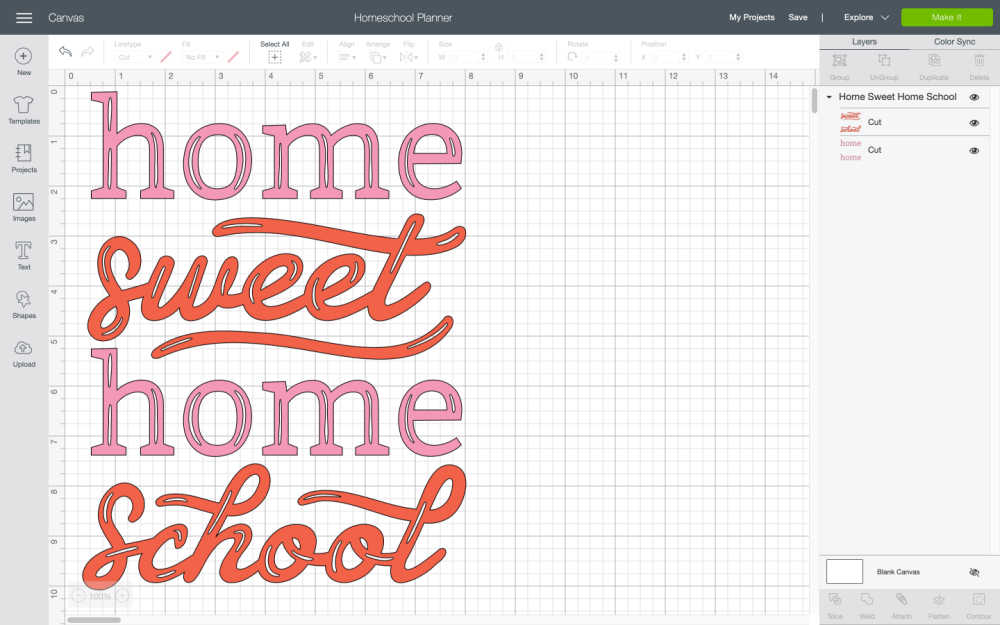 Start by logging into your Cricut Design Space account. Grab the design in our saved projects – Homeschool Student Planner. Add the design to Design Space.