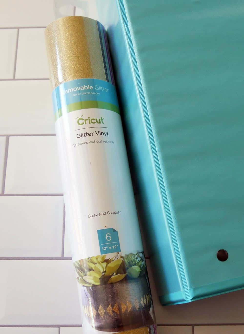 We did our student planner binder in Cricut Premium vinyl in teal and Cricut gold glitter vinyl. You can use either permanent or removable vinyl. We used removable in case we wanted to change up the look of the planner during the school year.