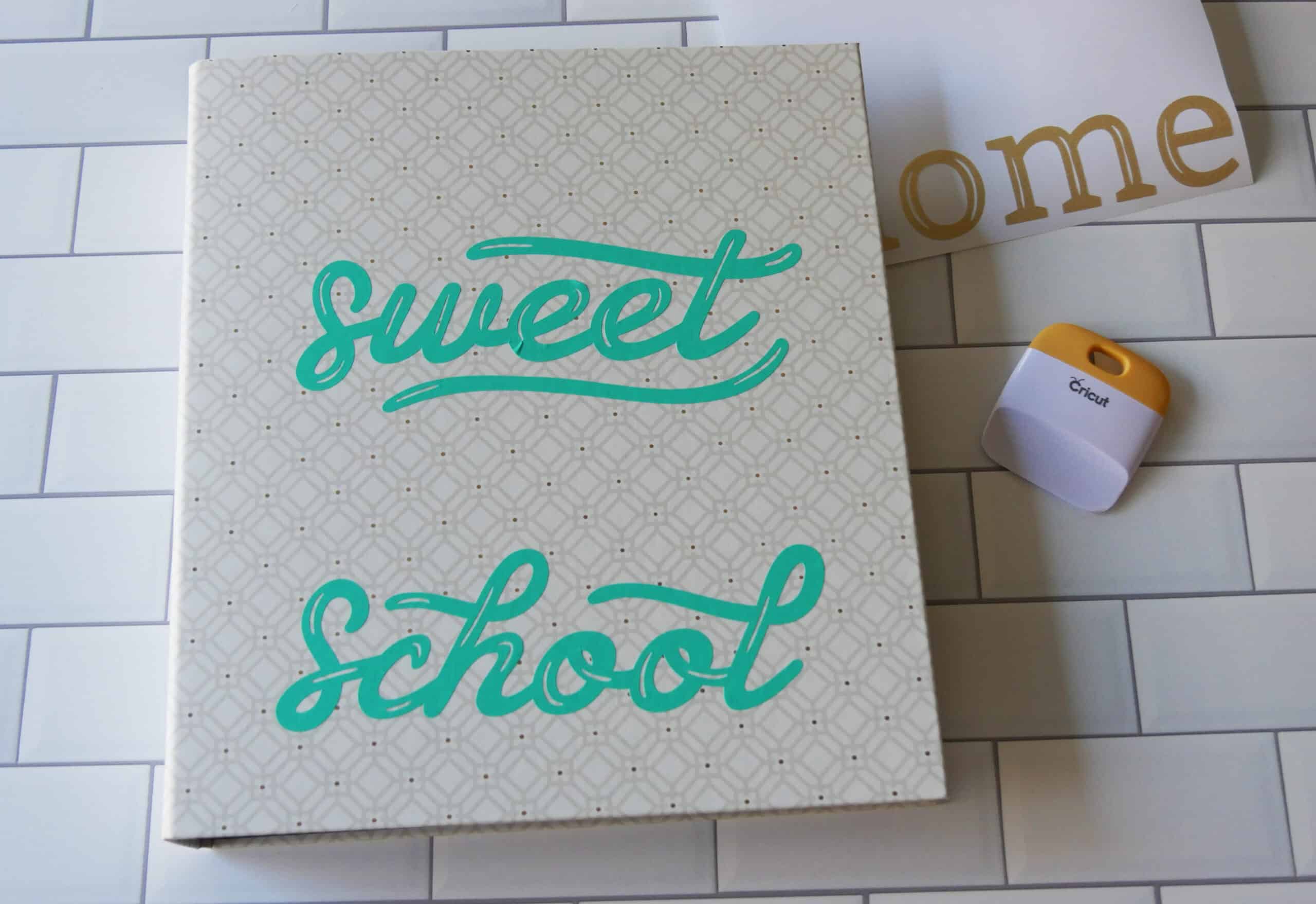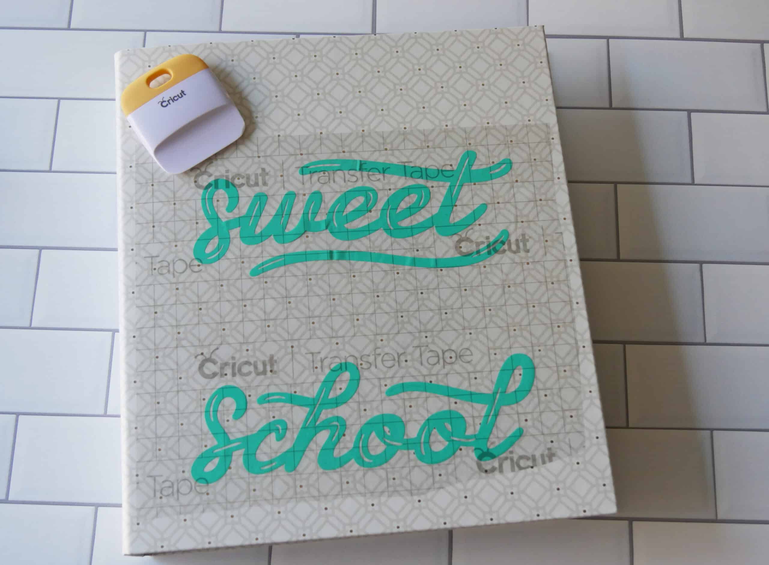 Start with the “sweet” and “school” cuts. Lay regular transfer paper on the front of the words. Then remove the backing. Place the words so that “school” is centered and on the bottom of the binder.