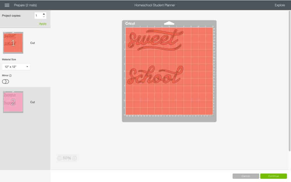 The machine will cut the first cut (the words “sweet” and “school”). It will pause after that cut and you can put the second vinyl on the mat and cut that.