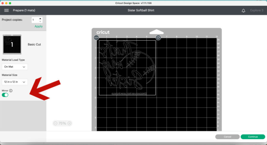Click “Make it” in the top right corner of Design Space. On the next screen, make sure to mirror the image before cutting. Click “Continue” and select Everyday Iron-On from the list of materials.