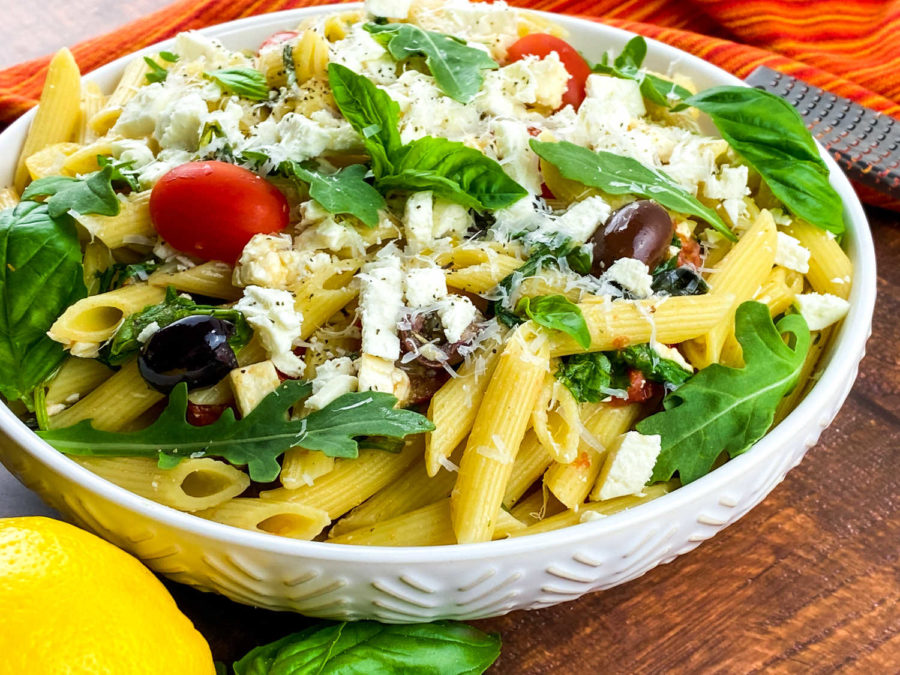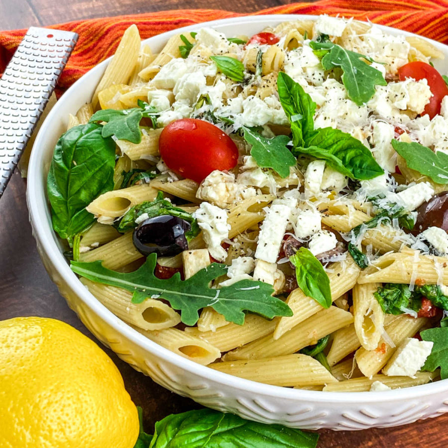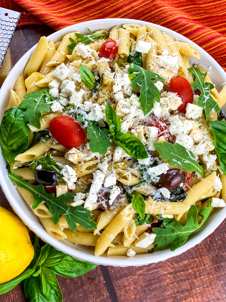 Greek pasta salad with lemon vinaigrette dressing is made with penne pasta, arugula, Kalamata olives, and feta cheese.