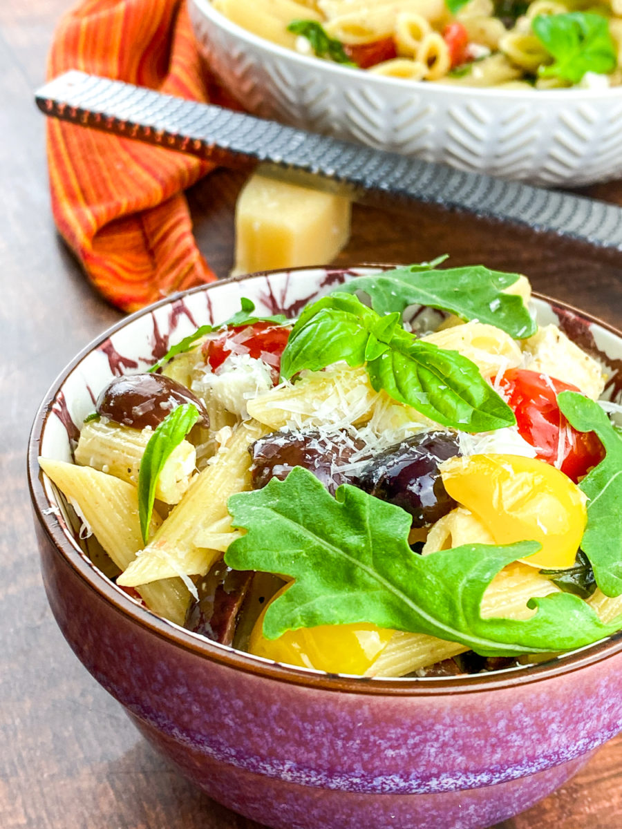 Greek pasta salad packs a lot of interesting flavors into each bite. From the peppery taste of fresh arugula to the salty appeal of Kalamata olives and Feta cheese, all tossed in a homemade lemon vinaigrette dressing, there is nothing bland or boring about this dish. Yet, the strong flavors aren’t overwhelming because they are tempered by the satisfying addition of hearty penne pasta.