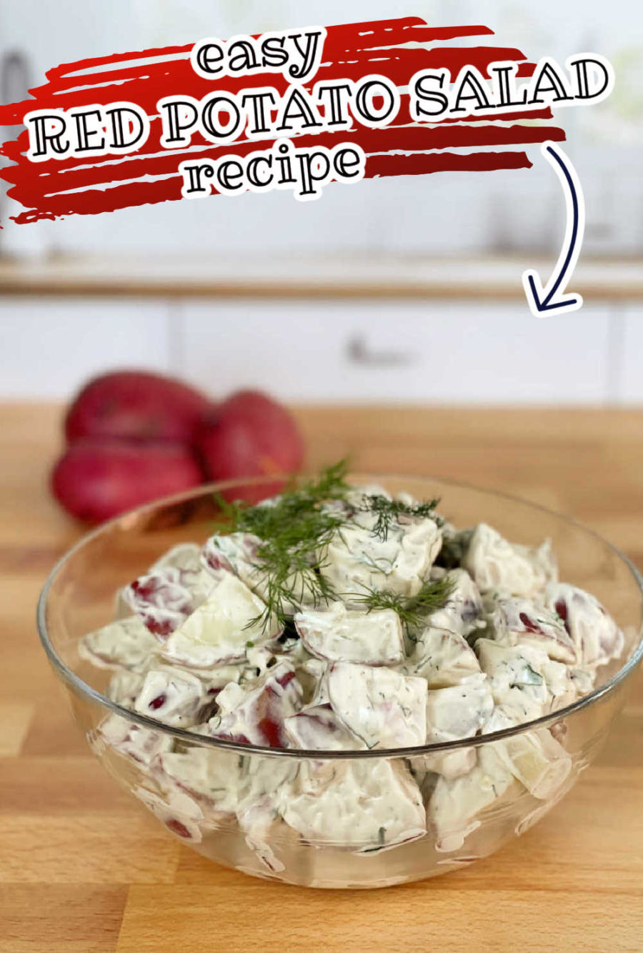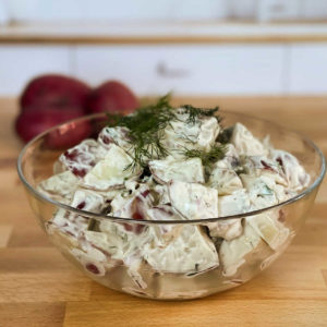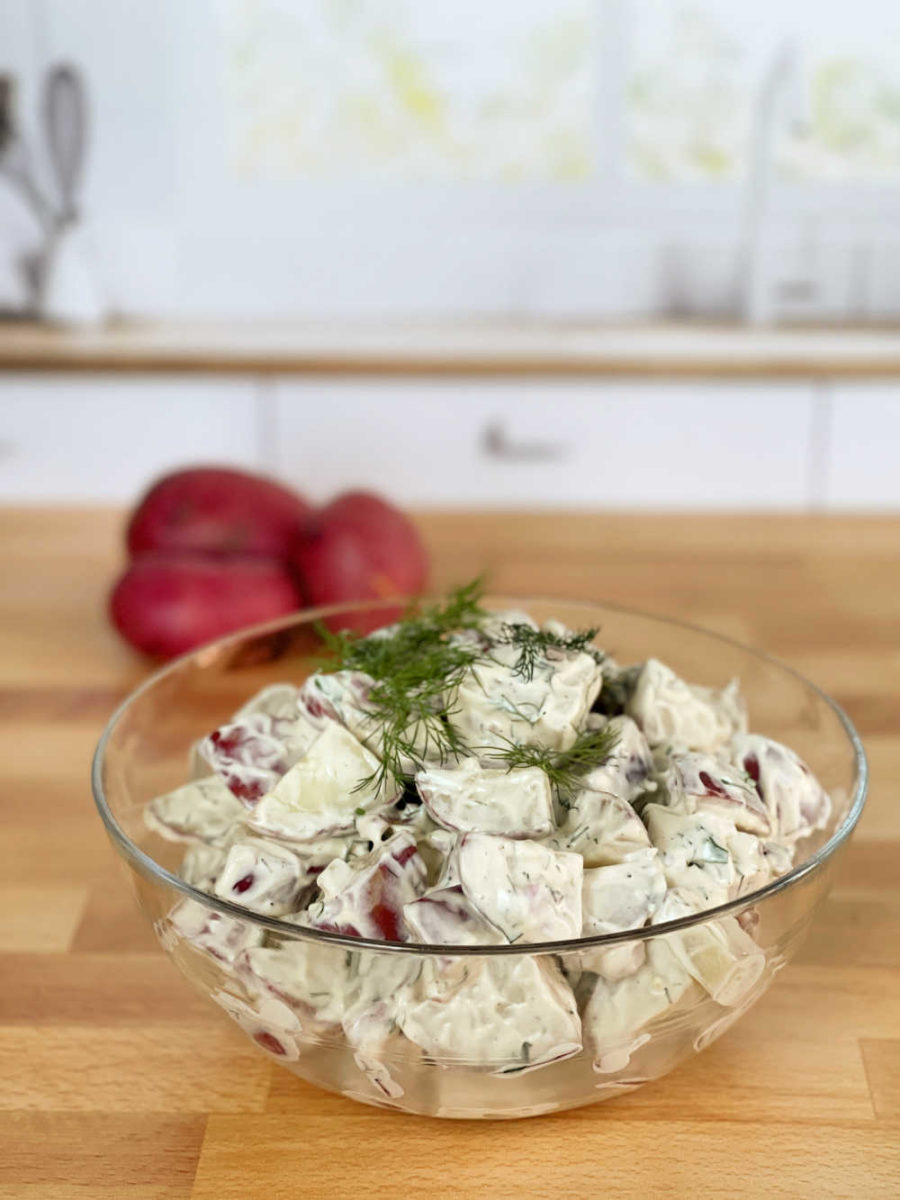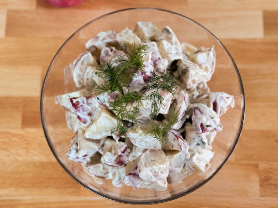 Easy red potato salad made with red potatoes, mayonnaise, sour cream, shallots, Dijon mustard, and fresh dill.