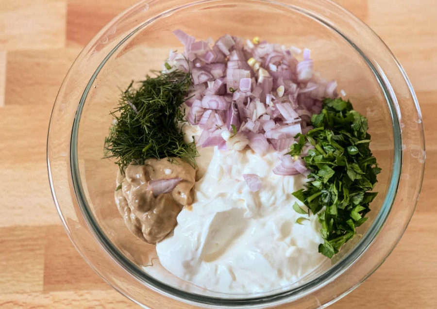 - In a small glass bowl, add mayonnaise, sour cream, shallot, mustard, and fresh herbs. Stir to combine thoroughly.