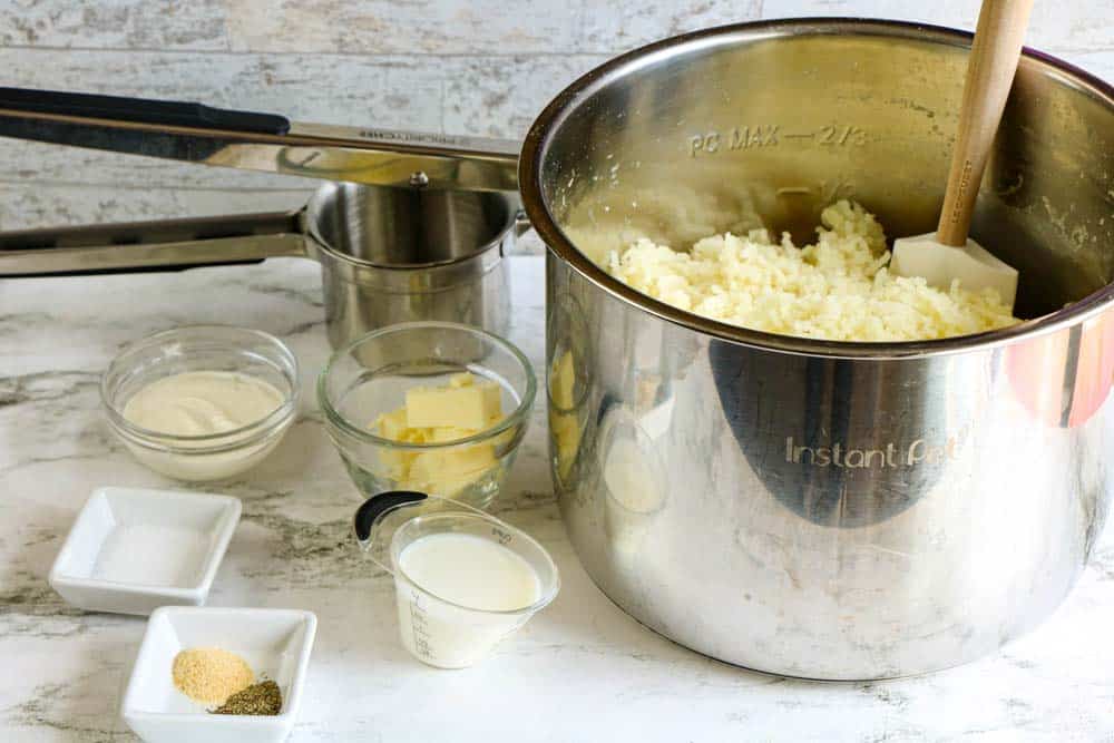 Once the pressure is released, open the top. Drain the potatoes well in a colander in the sink. Put the potatoes back in the pressure cooker or a large mixing bowl.