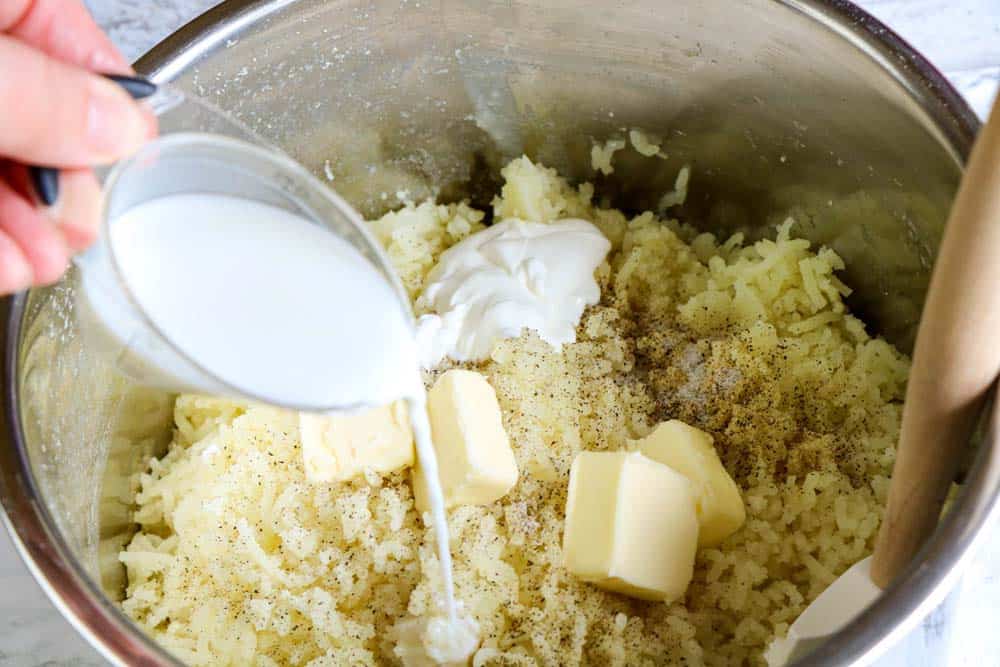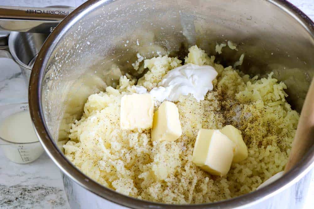 If you use a potato ricer, as pictured, you will want to rice the potatoes at this point. Add the butter to the potatoes. It’s best to let it melt completely but you don’t have to. Add the milk, sour cream, salt and pepper, and garlic powder.