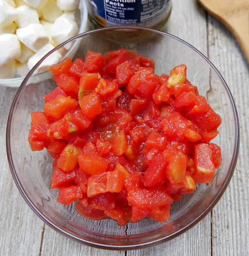 - Drain a can of petite diced tomatoes. Try to get out as much of the water as possible.