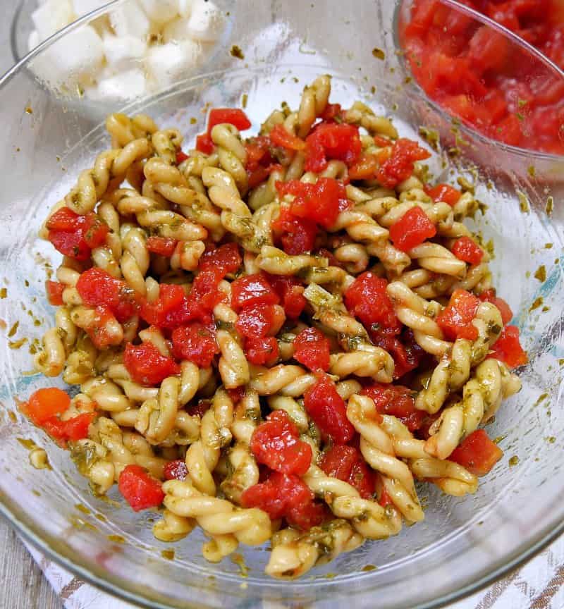 Gently toss a couple of tablespoons of the tomatoes with the pasta and pesto. Use more or less tomatoes to your liking.
