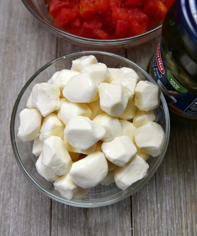 Finally, add the mozzarella to the salad. Mozzarella pearls are perfect bite sized morsels for the salad. They are available in the refrigerated section of Walmart.