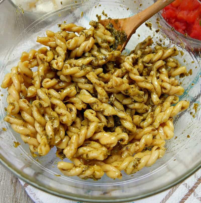 Toss about half a cup of the mozzarella pearls into the pasta salad. Make sure to coat the pearls in the pesto sauce.