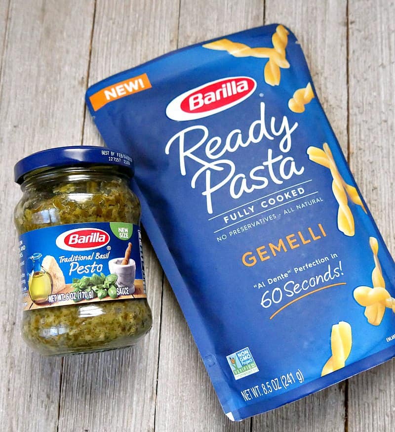 The trick to making this caprese pasta salad in 10 minutes is using Barilla’s new Ready Pasta. Made with just three simple ingredients, sea salt, olive oil and pasta, each package serves 2. You heat the pasta in the microwave in 60 seconds and it’s ready to go. The Ready Pasta and pesto sauce are both available at Walmart in the pasta aisle.