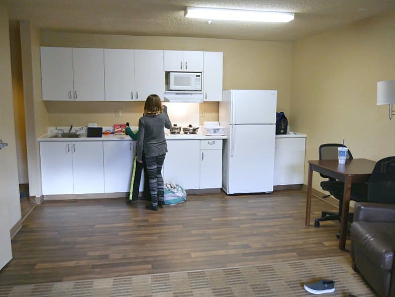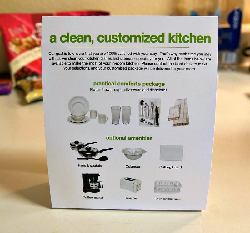 Having a kitchen in your room is fabulous! We ate breakfast and dinner in our room and had lunch in the parks. This saved us so much money. The kitchen does not have an oven, though, so plan ahead for that. Extended Stay America has a fun site, Away from Home Cooking, with tons of recipes ideas for their kitchens, too.