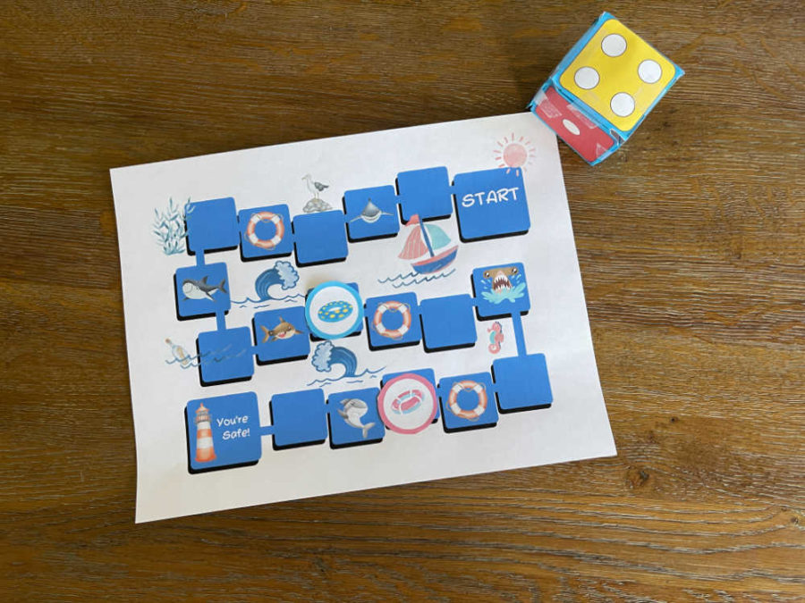 Pin For LaterTo play Shark Attack, you will need to first purchase, download and print all the game pieces. The game comes with printable game board, players’ tokens, rules, and paper dice you can print and make if you don’t already have any.