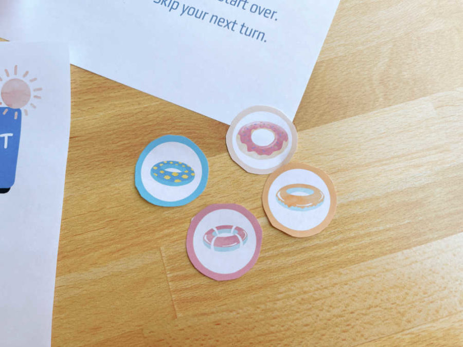 There are 4 pool floaties that are the tokens for the game. Print the and cut them out. Each person will need a token to play.