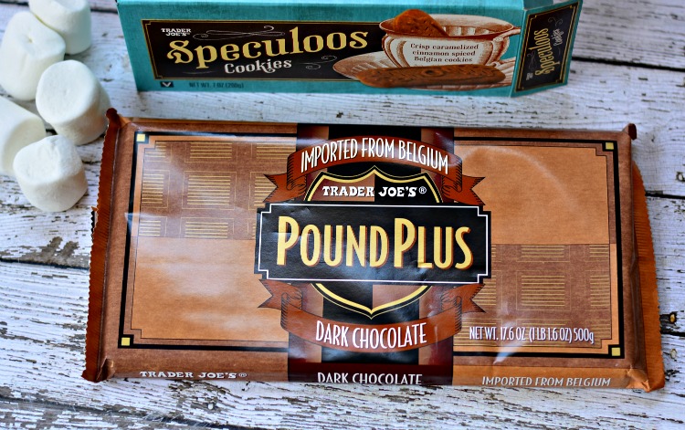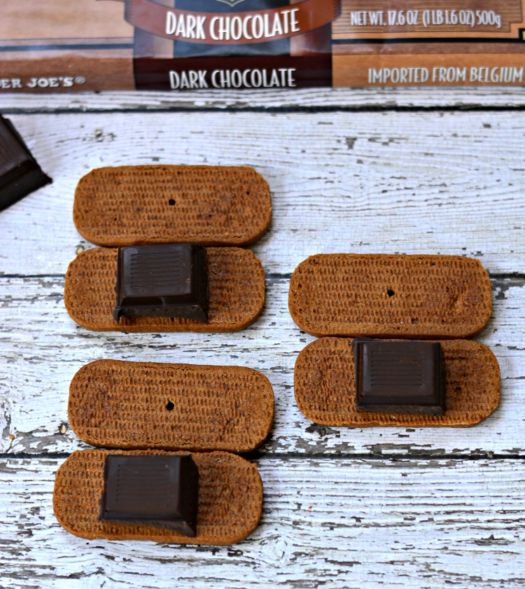 In place of the traditional graham cracker, I used Speculoos, a Belgian spiced cookie. If you aren’t near a Trader Joe’s, Speculoos remind me of the windmill cookies I ate as a kid at about every classroom party we had. Those would definitely work and make bigger s’mores.