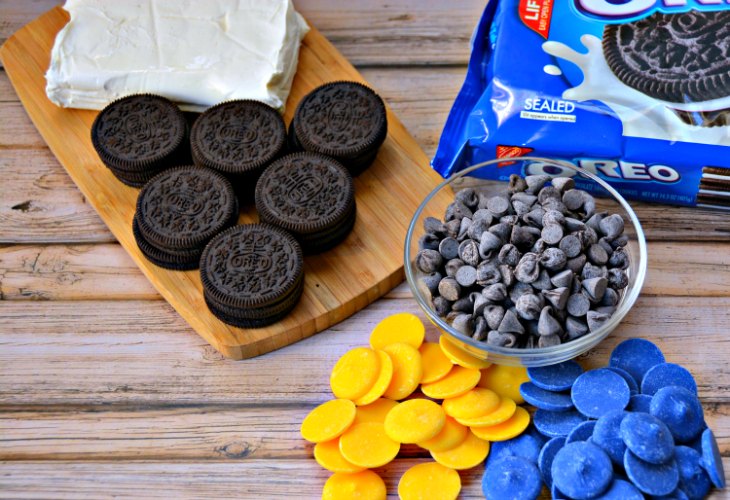 I’ve always made OREO Cookie balls with the basic ingredients – OREO cookies, cream cheese, and chocolate chips for the outside. But with football season ending and everyone focusing on rooting for their favorite teams to win, I thought it would be fun to make some OREO cookie balls in team colors. I choose blue and yellow because I have a team I root in those colors, but just pick your favorite colors and buy the corresponding candy melts.