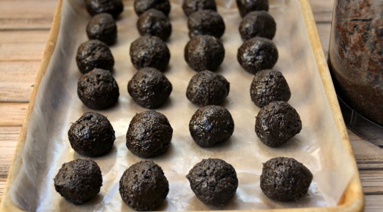 - SHAPE into 48 (1-inch) balls. Freeze 10 min. Dip balls in melted chocolate; place in single layer in shallow waxed paper-lined pan.