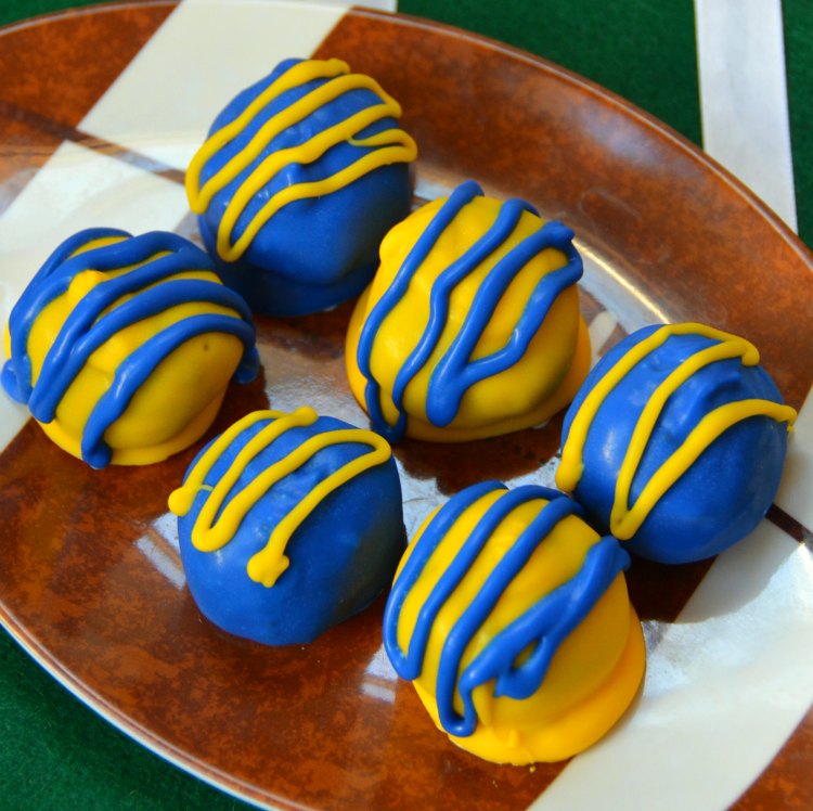 To make the cookie balls in team colors, use candy melts in place of the chocolate. After dipping the balls in the melts, let them harden and set. Melt the other color of candy and drizzle that on after the first color is set. It gets messy if you try to drizzle over wet candy!