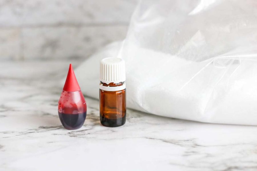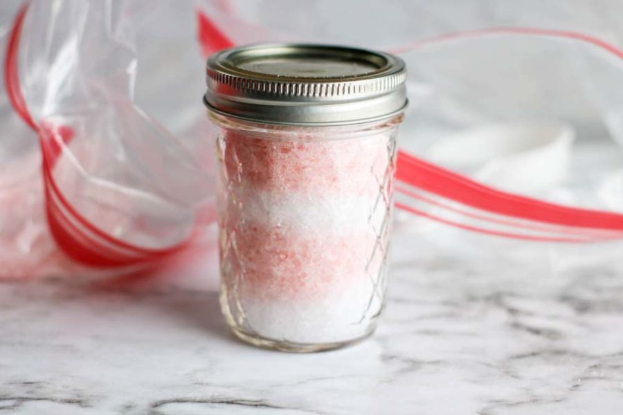 At this point, the salts are ready to use. But you can go one step further and add some coloring to make a festive candy cane stripe.