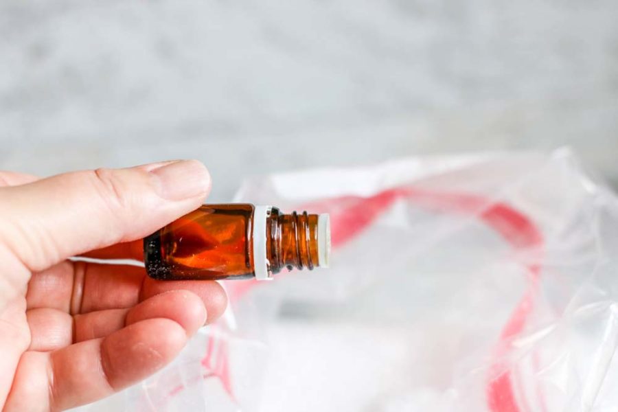Next, add drops of peppermint essential oil to the salt. Seal the bag and shake well.