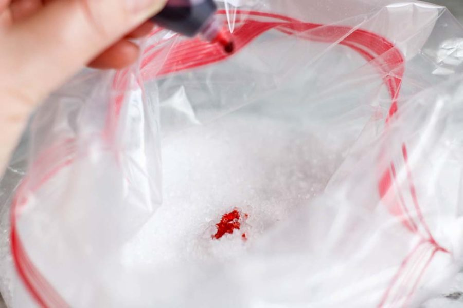 - Seal the bag and knead the salts until the color is evenly distributed. Be aware that too much food coloring can cause the salts to harden over time.
