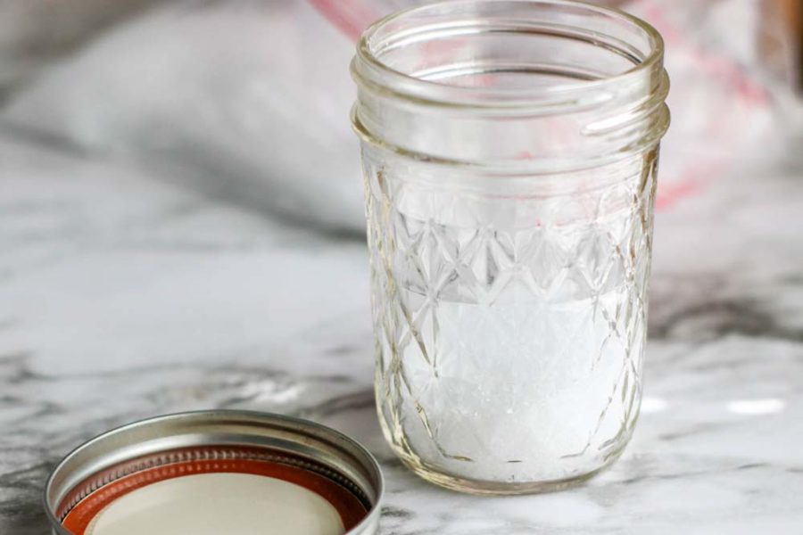 Add Epsom salt to a gallon-size freezer bag. You can use any combination of salts — Epsom, rock, sea salt, for example, or you can just use one kind of salt. Epsom salts are found pretty much anywhere that has a pharmacy.