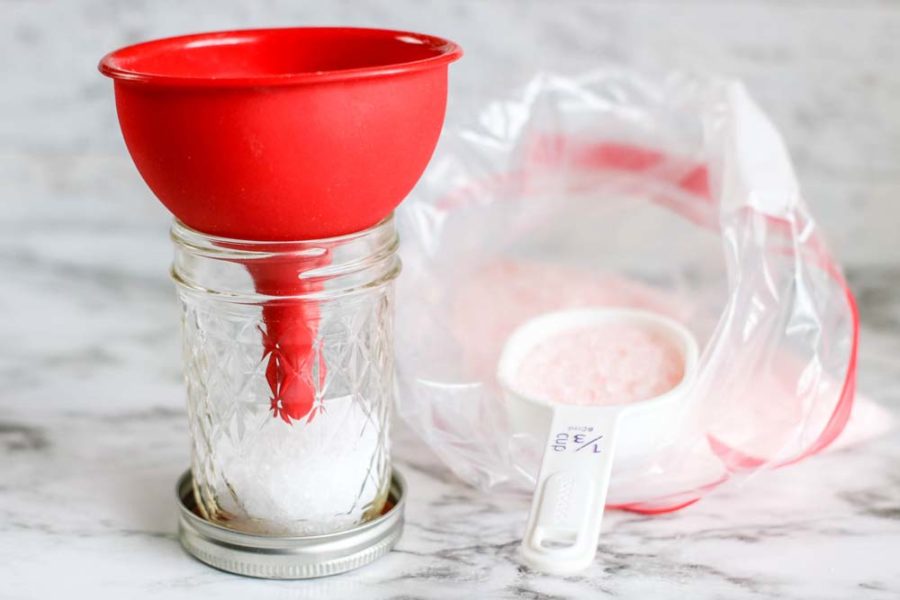 - Transfer salts to decorative jars, using the funnel to layer red and white if desired, and seal.