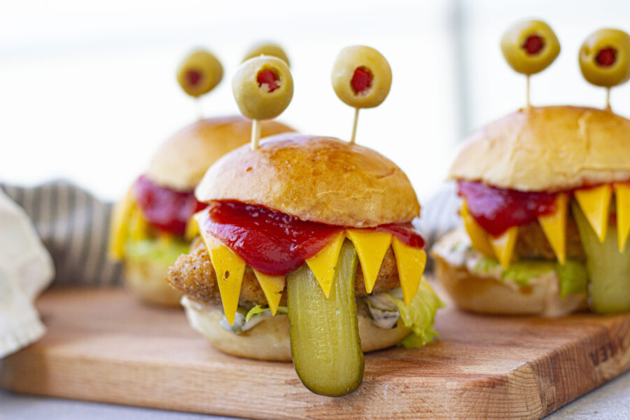 Make Monster Burgers using hamburgers, chicken, or even fish patties. Serve with a veggie tray and potato chips for an easy meal.