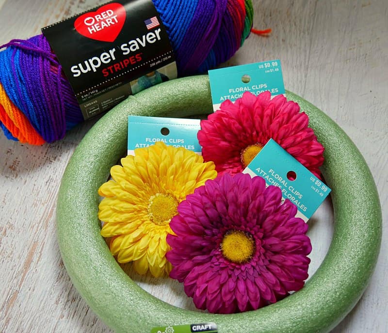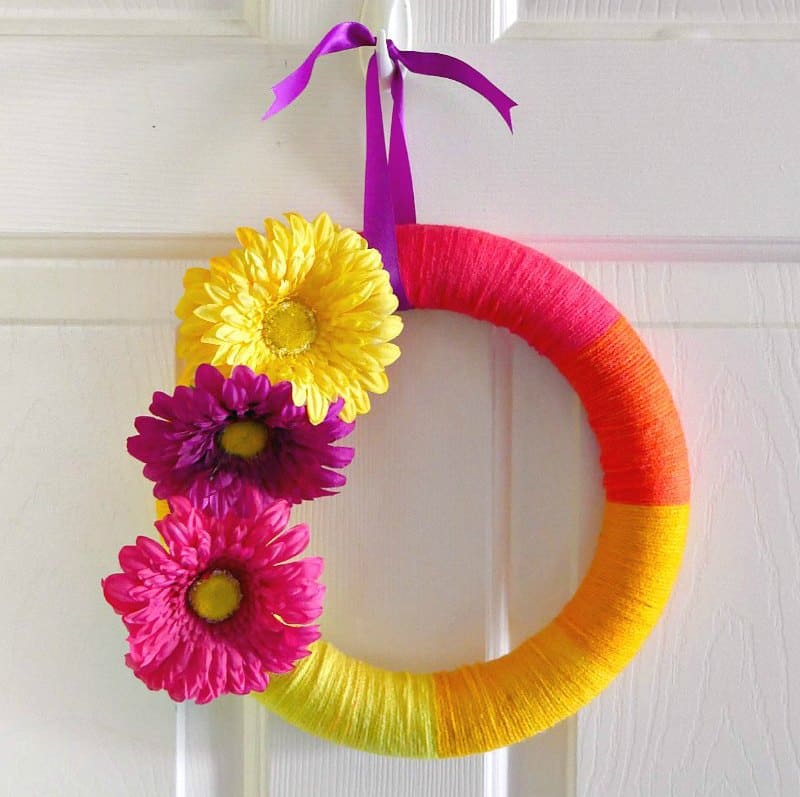 Use the hot glue to embellish the wreath. We used inexpensive silk flowers, but I really wanted some colorful popsicles! The Fruity Stripe yarn has a purple stripe in it that the yarn didn’t get to when making the wreath. Instead, the orange repeated itself. So we covered the other orange stripe with the flowers.