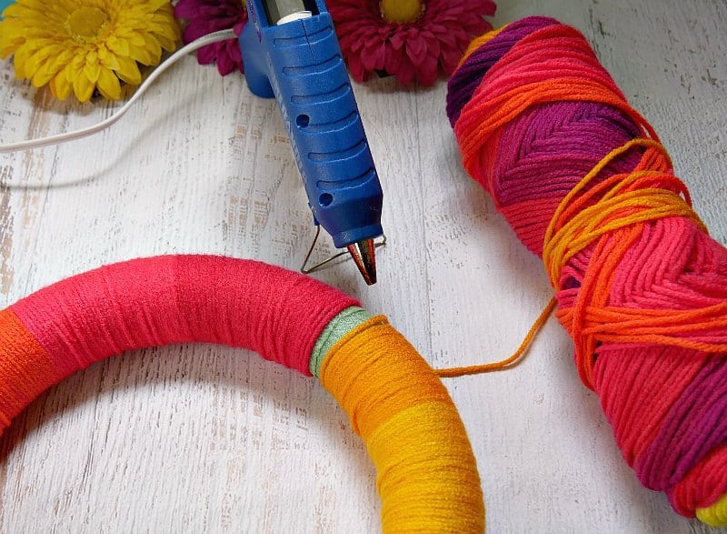 When you get near back at the beginning where you started wrapping the yarn, add a dab or two of hot glue. Wrap the remaining yarn over the glue. Trim the end.