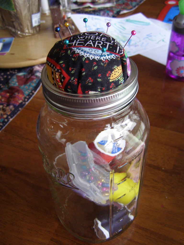 Al you really need is a jar (any size will work); a small piece of fabric, and some craft stuffing. Just take some craft stuffing and put it over the lid (the flat disk) then pop it in the band. It just sticks right in there! Trim up the fabric so that you can screw on the band. Fill the jar with sewing odds and ends, or not!