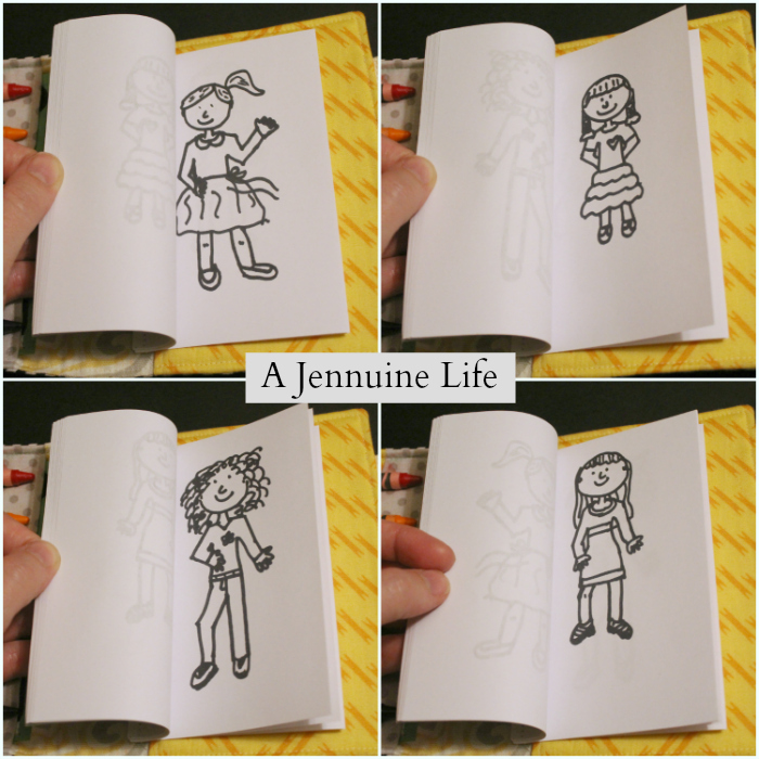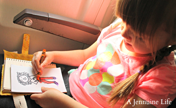 This coloring book was put to the test and it performed beautifully! My only complaint is that she colors so quickly that she was more than halfway done with her “girlies” on the flight out! We found an added benefit to sewing the pages together in that the perforations made it easy to pull out pages she wanted to show to Grandma.