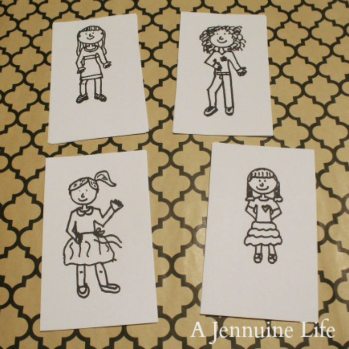 Don’t worry, I have no illusions that I’m a great artist. Arden seems to appreciate them, and that’s what matters, right? I cut the girls to the size of the cardboard backing.