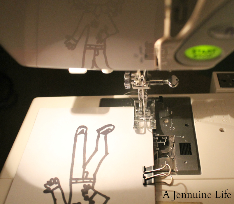 All you need is your subject drawing or printout, a printer/copier, a scrap of cardboard, and access to a sewing machine. I used a box from a snack package cut to size to use as the rigid backing for my notebook. I drew four different versions of the “girlies” onto two pages and scanned them into our home printer and printed five copies of each.