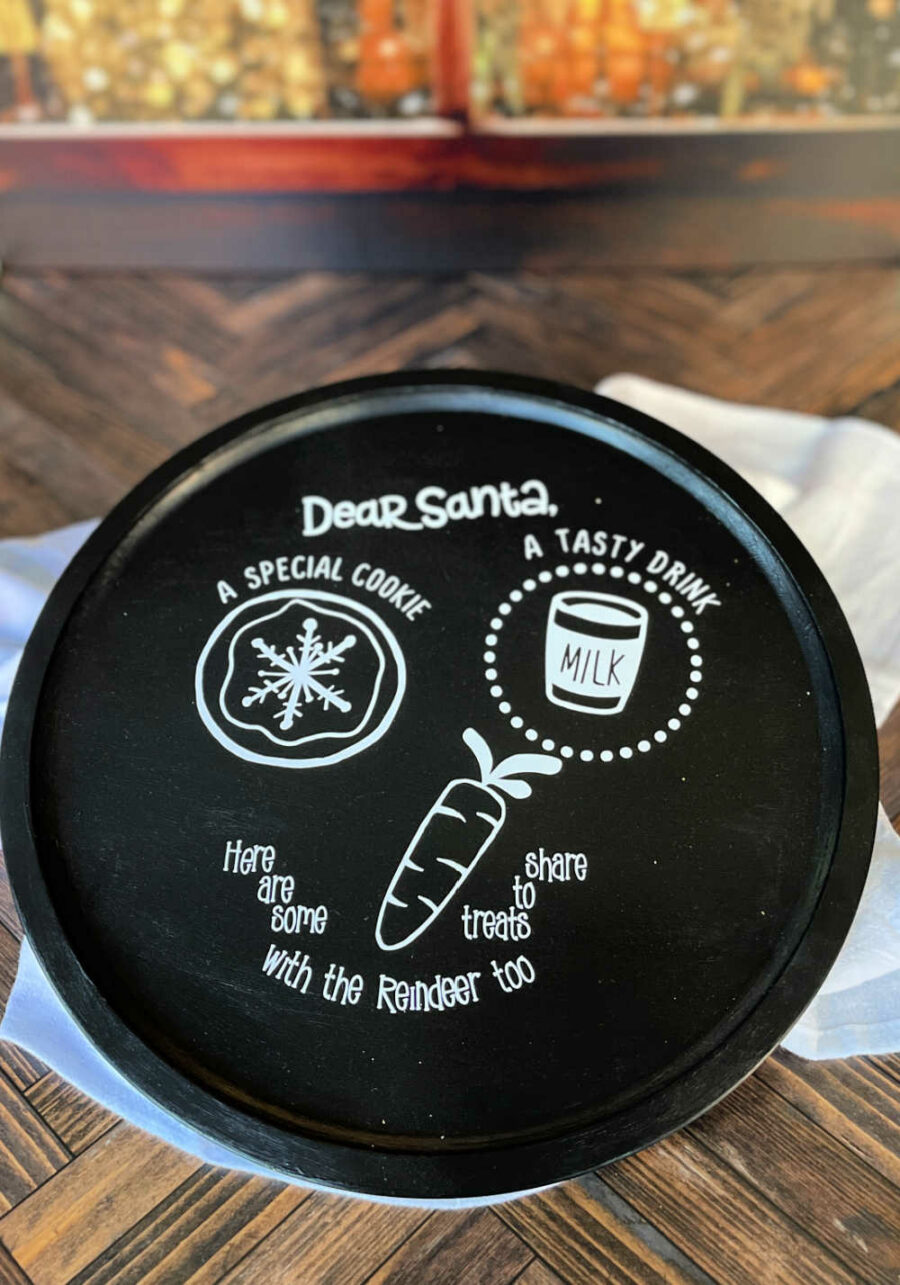 Make your own Santa cookie platter for Christmas Eve using a dollar store pizza pan and cuttable vinyl.