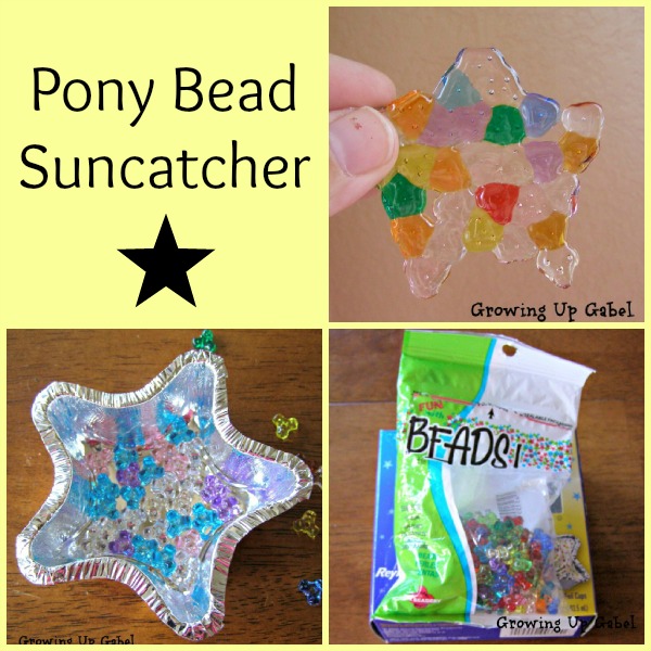 Last week we were studying the letter “S” and “s is for sun” as part of our homeschool lessons. We were getting a little bored with just worksheets so I went on a search for a sun themed craft. I thought about making a sun with hand prints – you know I love Christmas tree or reindeer handprints, but I wanted a non-messy craft. I found a cute idea to melt pony beads in to suncatchers on Pinterest. I adapted the craft to make smaller, star shaped sun catchers so that we could make them in the toaster oven.