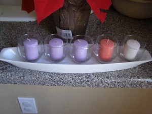I decided to start by purchasing pink and purple votive candles and small holders. I paid $1 each for the candle the clear glass holder. I had absolutely no idea what I was going to do with them. I was thinking of just putting them in a circle on a lazy susan I have in the middle of our table. When I got home I remembered the long white serving dish that I picked up for free at Pier One a few months ago.