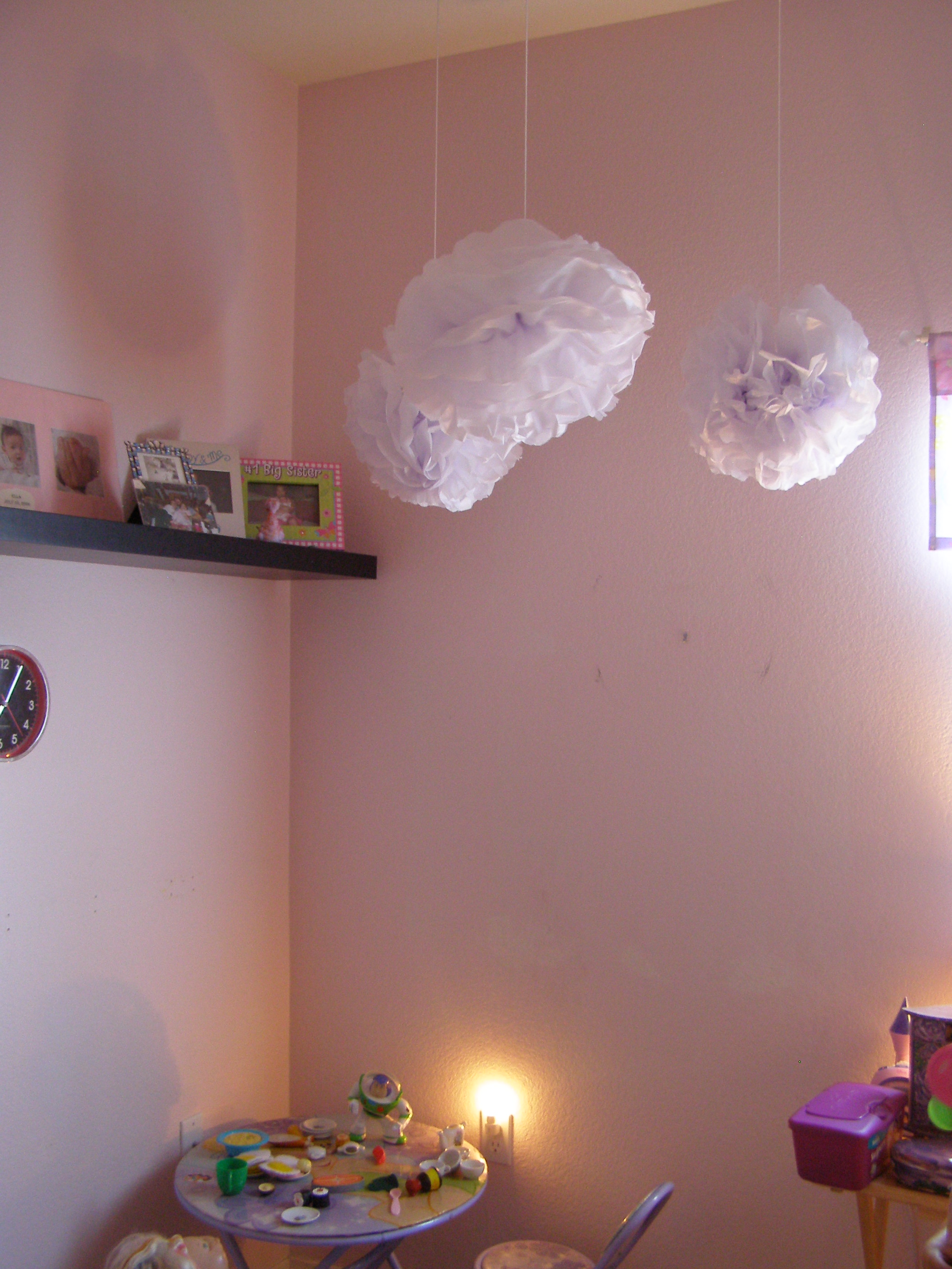 We just put them on thumbtacks and yarn and stuck them in the ceiling. They are frilly and lovely and Ella wants at least 100 more. Good think I have a lot of tissue paper.